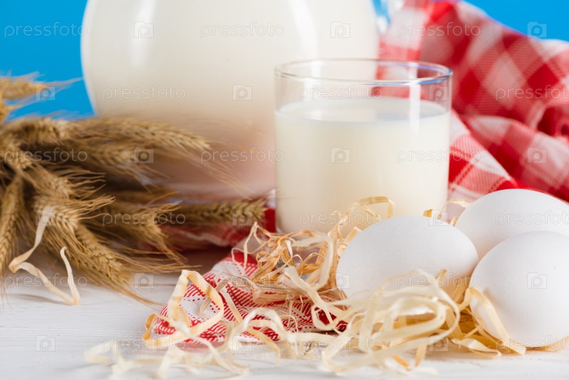Свежее молоко в стакане и яйцо с колосьями пшеницы на деревянном столе