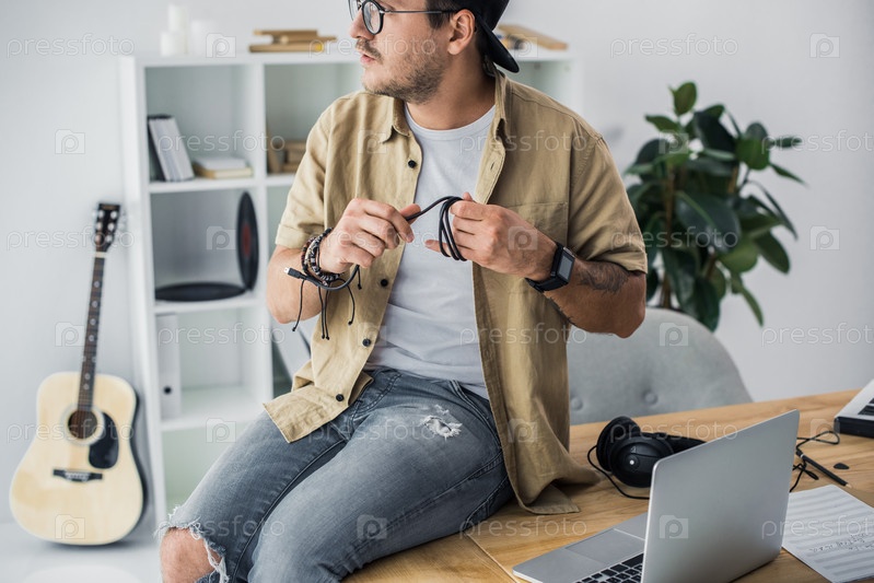 Красивый молодой человек, сидя на столе