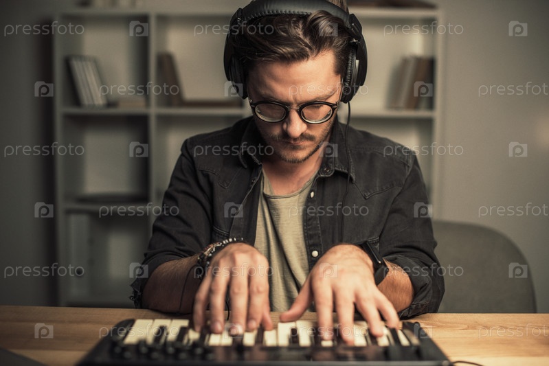 Красивый молодой человек с наушниками работает с контроллером клавиатуры