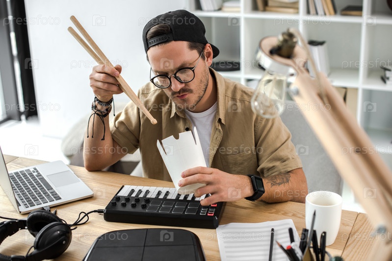 Молодой вдумчивый музыкант ест китайскую пищу с палочками