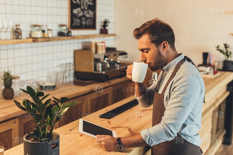 Бариста пьет ароматный кофе во время использования планшета