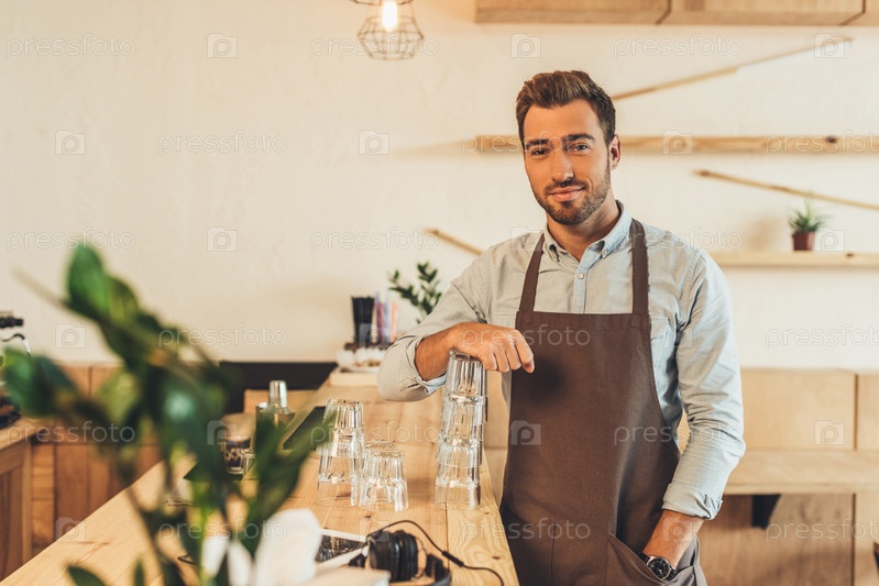 Портрет улыбающегося бариста в фартуке, стоя у стойки в кафе