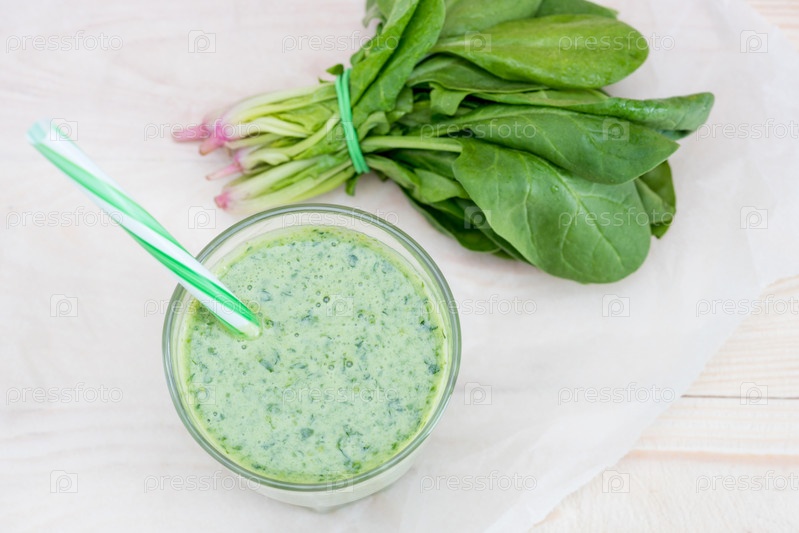 Свежий зеленый коктейль со шпинатом в стакан с соломкой