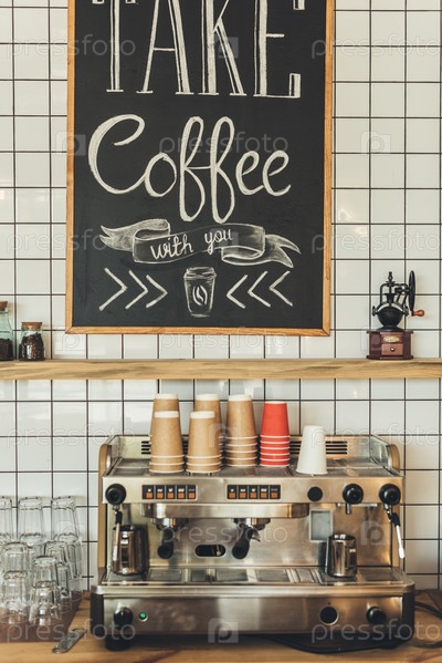 Кофеварка, посуда и бумажные стаканчики в буфете