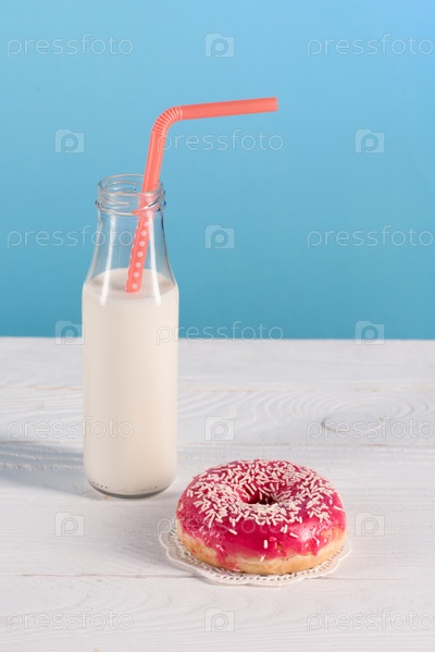 Сладкий пончик и свежее молоко в стеклянной бутылке на столе