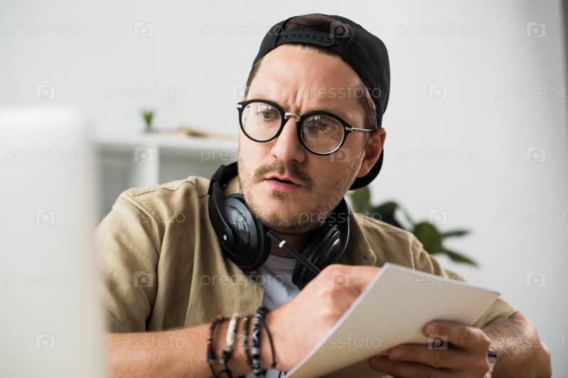 Сконцентрированный молодой человек, пишущий в записной книжке