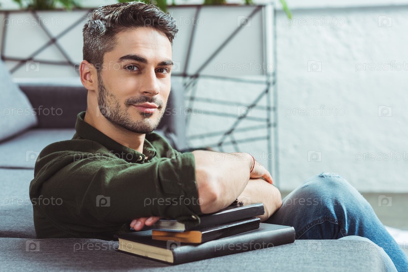 Красивый молодой мужчина студент с книгами, глядя на камеру
