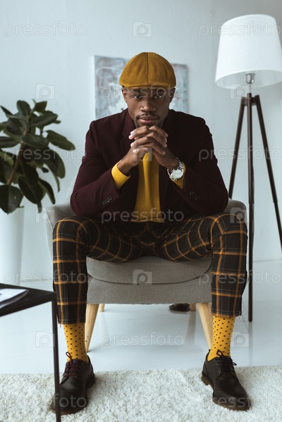 Задумчивый моден афро-американский человек, сидящий в кресле в современном офисе