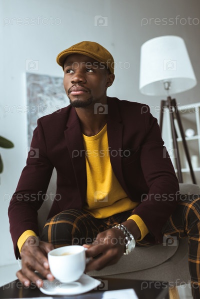 Красивый стильный афро-американский бизнесмен в кепке с чашкой кофе
