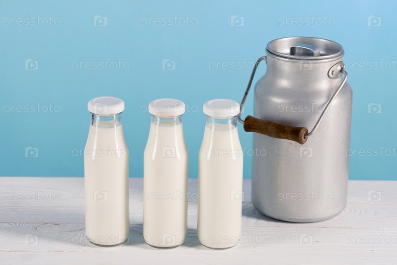 Свежее молоко в стеклянных бутылках и бидоне