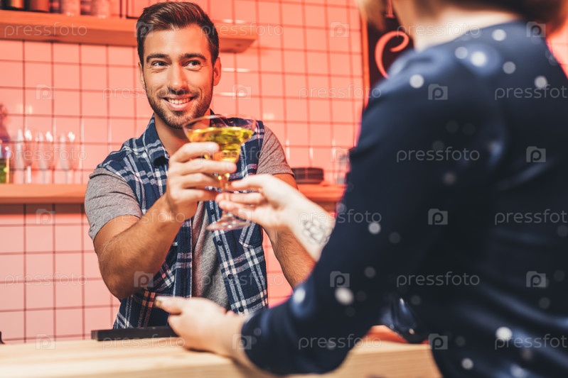 Портрет улыбающегося молодого бармена, давая коктейль женщине в баре