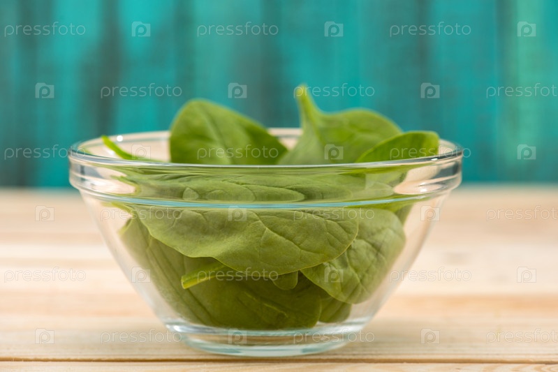 Чаша свежего шпината на деревянной столешнице