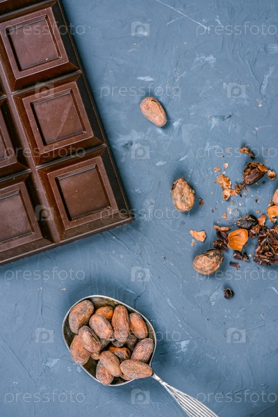 Шоколад и ложка какао-бобов