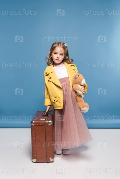 Симпатичная задумчивая девочка держит плюшевого мишку и чемодан