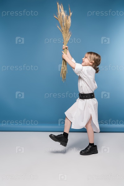 Красивая маленькая девочка в белой рубашке с колосьями пшеницы