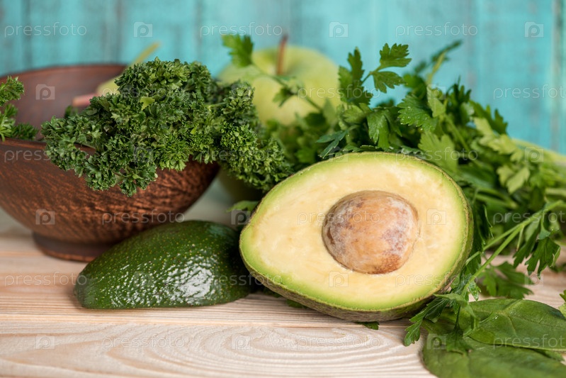 Авокадо с петрушкой и яблоко с зелеными листьями на деревянном столе
