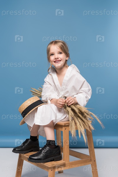 Очаровательная маленькая девочка в белом платье с колосьями пшеницы