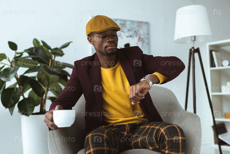 Стильный афро-американских человек с чашкой кофе, глядя на часы