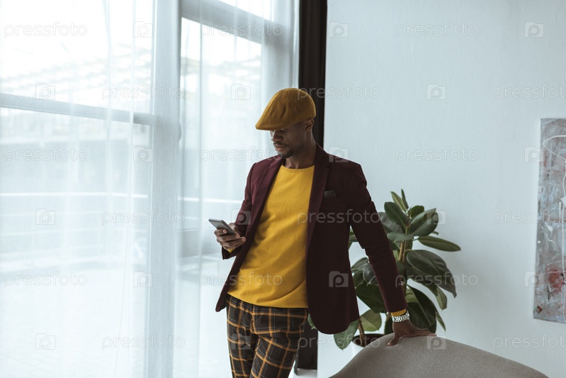 Красивый стильный афро-американский бизнесмен в кепке, используя смартфон в современном офисе
