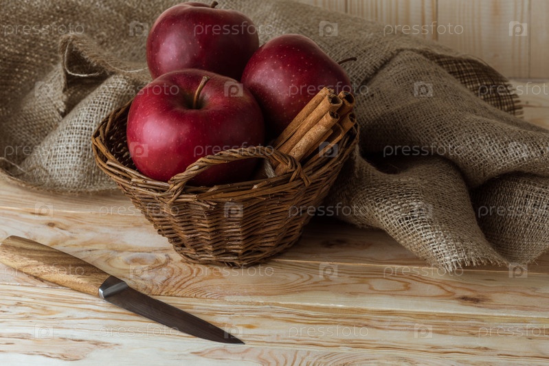 Свежие красные яблоки и палочки корицы в плетеной корзине