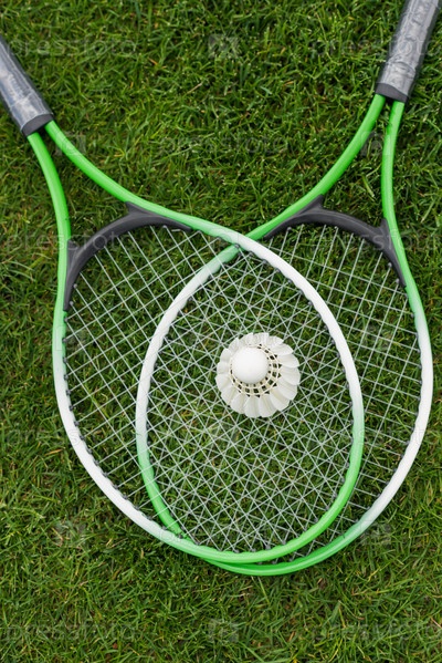 Волан и ракетки для бадминтона на зеленой траве