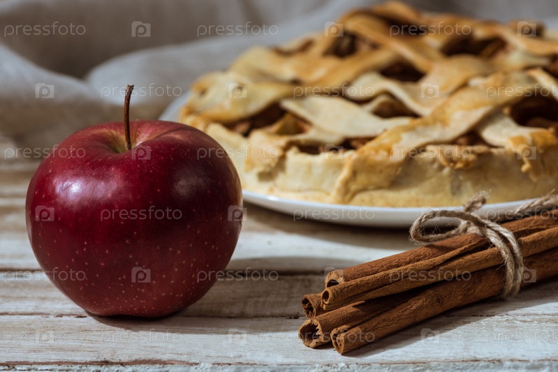 Свежее яблоко и палочка корицы с домашним яблочным пирогом