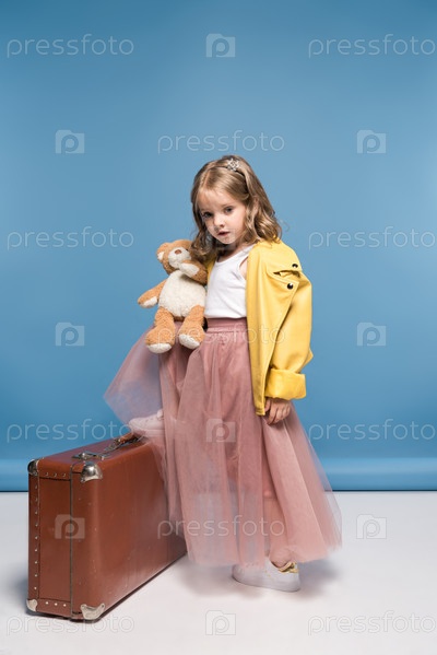 Красивая маленькая девочка в розовой юбке позирует с плюшевым мишкой и чемоданом