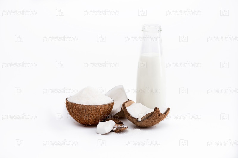 Кокосовая стружка и кокосовое молоко в стеклянной бутылке