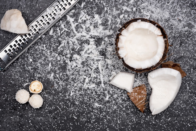 Кокос и кокосовая стружка на черном