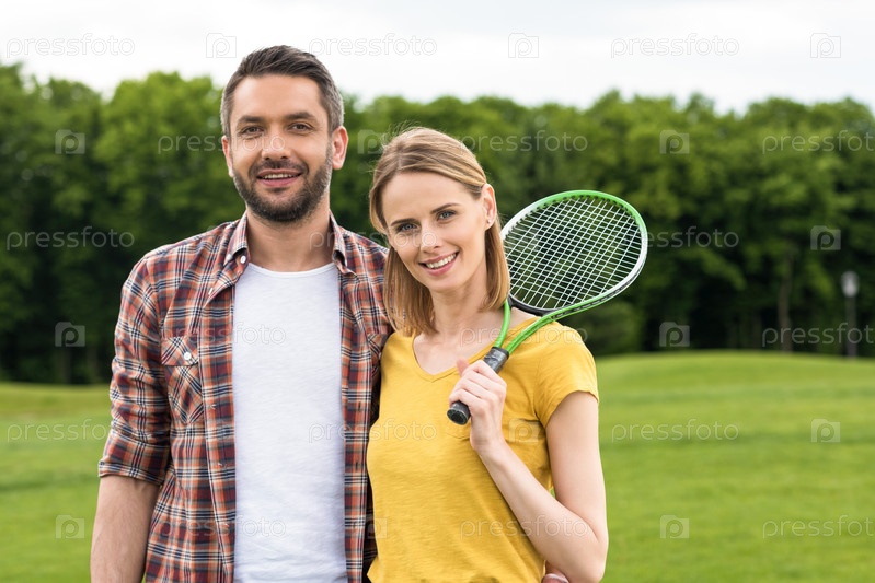 Счастливая молодая пара с ракеткой для бадминтона, стоя вместе в парке