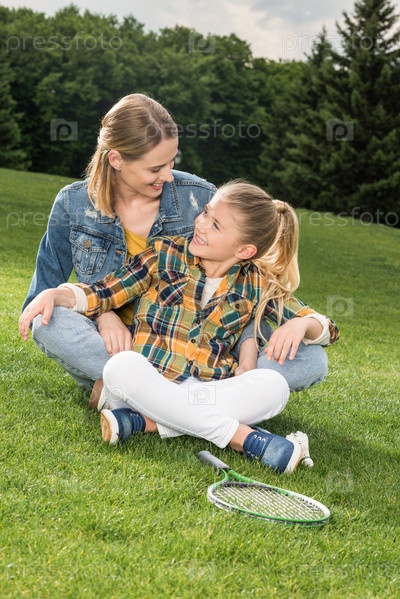 Счастливая мать и дочь с бадминтонной ракеткой