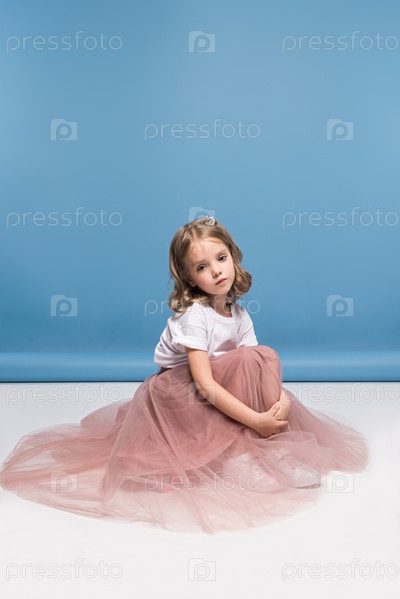 Очаровательная девочка в розовой юбке сидит на полу