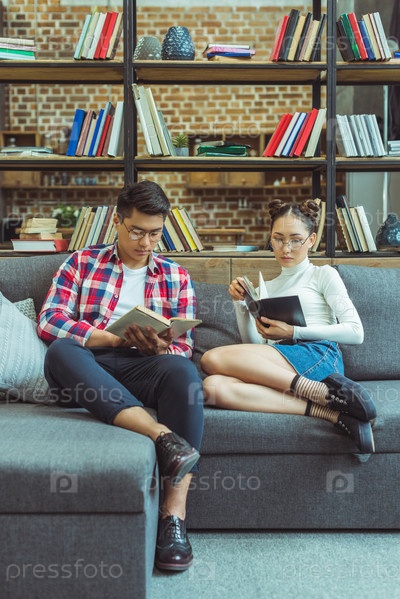Молодые азиатские студенты в очках для чтения книг в библиотеке
