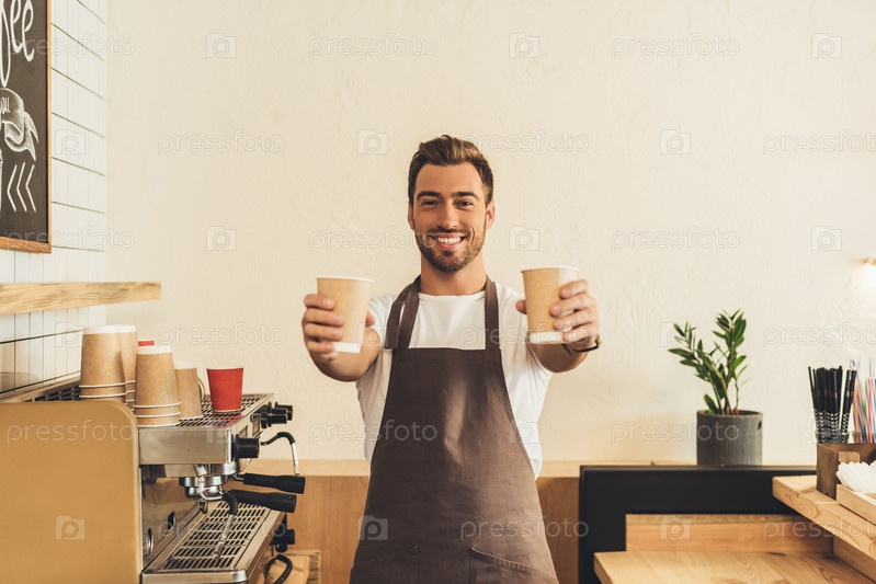 Бариста в фартуке показывая кофе