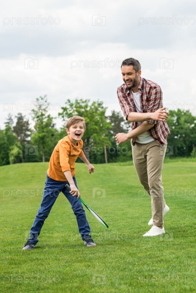Улыбающийся отец учит сына играть в бадминтон в парке