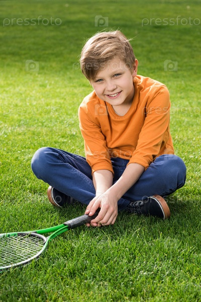 Счастливый маленький мальчик с ракеткой для бадминтона на траве
