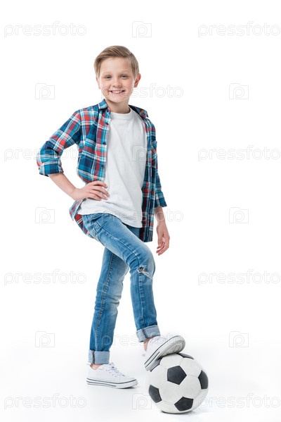 Симпатичный маленький мальчик, стоя с футбольным мячом