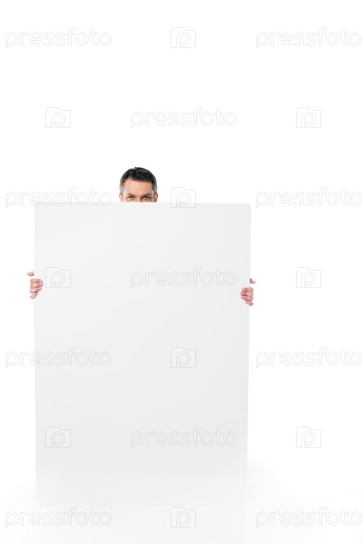 Мужчина держит пустой баннер в руках