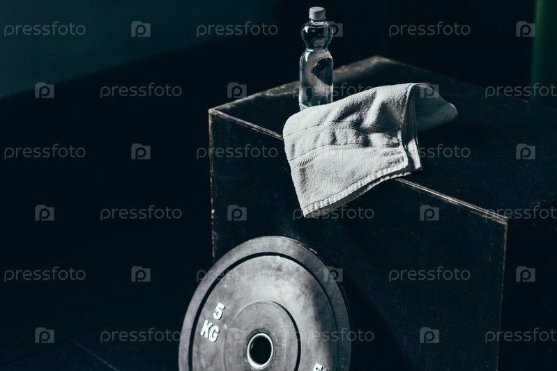 Гантели, бутылка воды и полотенце на кубе в тренажерном зале