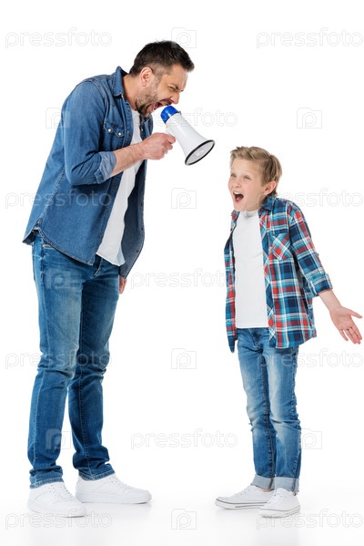 Отец держит мегафон и кричит на сына