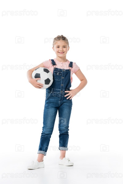 Симпатичная маленькая девочка, стоя с футбольным мячом