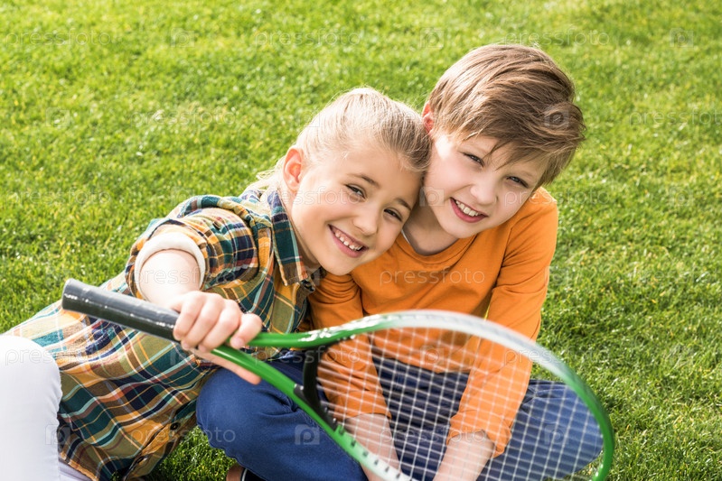Счастливые дети, играющие с ракеткой для бадминтона