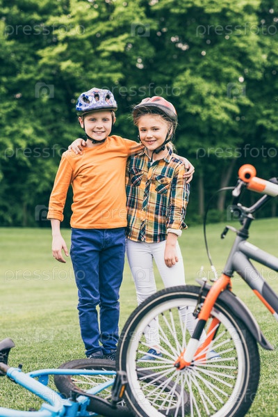 Дети стоя возле велосипедов в парке