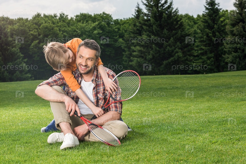 Маленький сын обнимает отца на зеленой лужайке