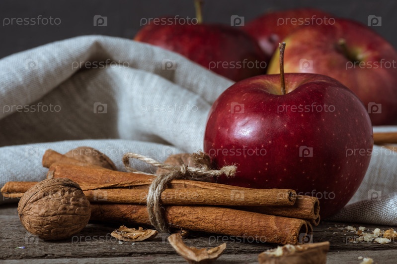 Свежие красные яблоки, палочки корицы и грецкие орехи