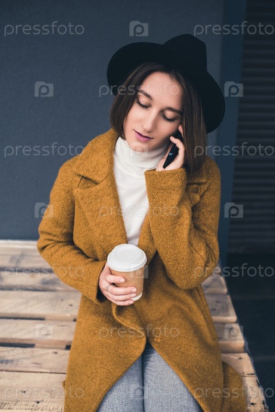 Портрет модной молодой женщины с кофе
