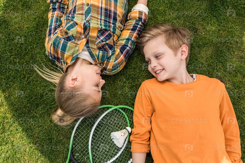 Вид сверху детей на зеленой лужайке с бадминтоном