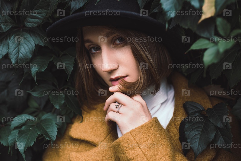 Портрет красивой задумчивой женщины в шляпе среди зеленых листьев