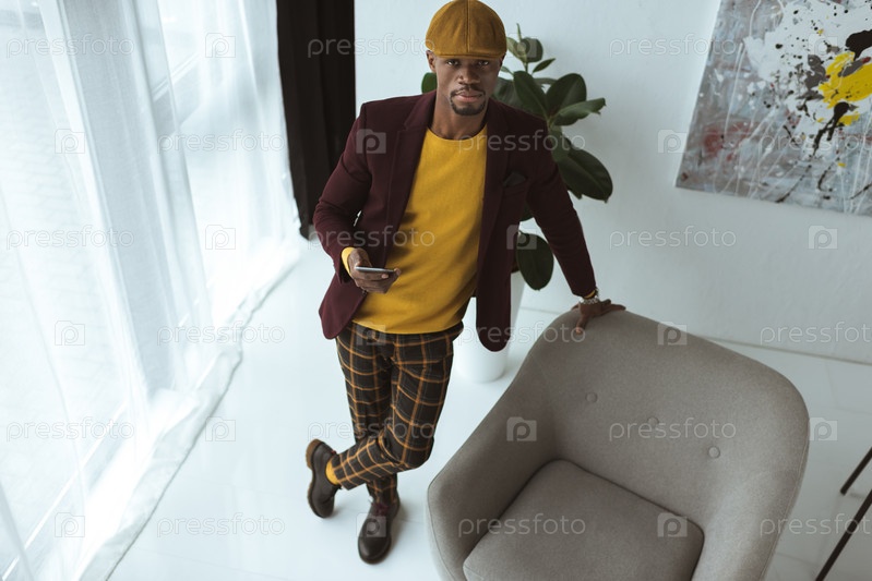 Модный афро-американский человек в кепке и клетчатых штанах, используя смартфон в современном офисе