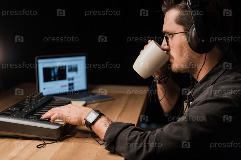 Молодой музыкант работает с контроллером клавиатуры в темной комнате
